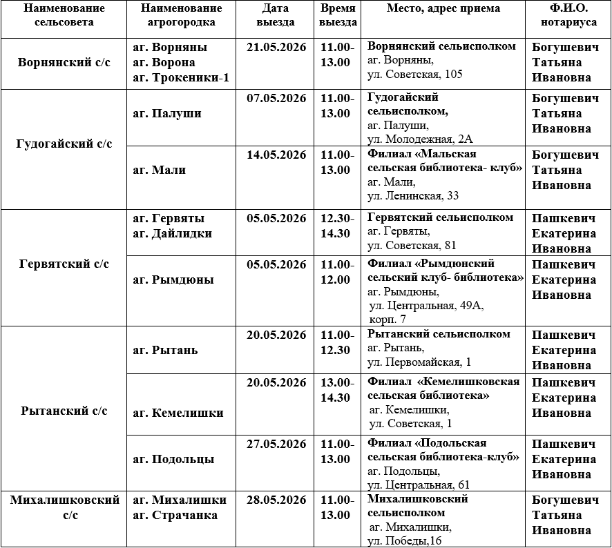 В мае 2026 года запланированы выезды нотариусов в агрогородки по графику