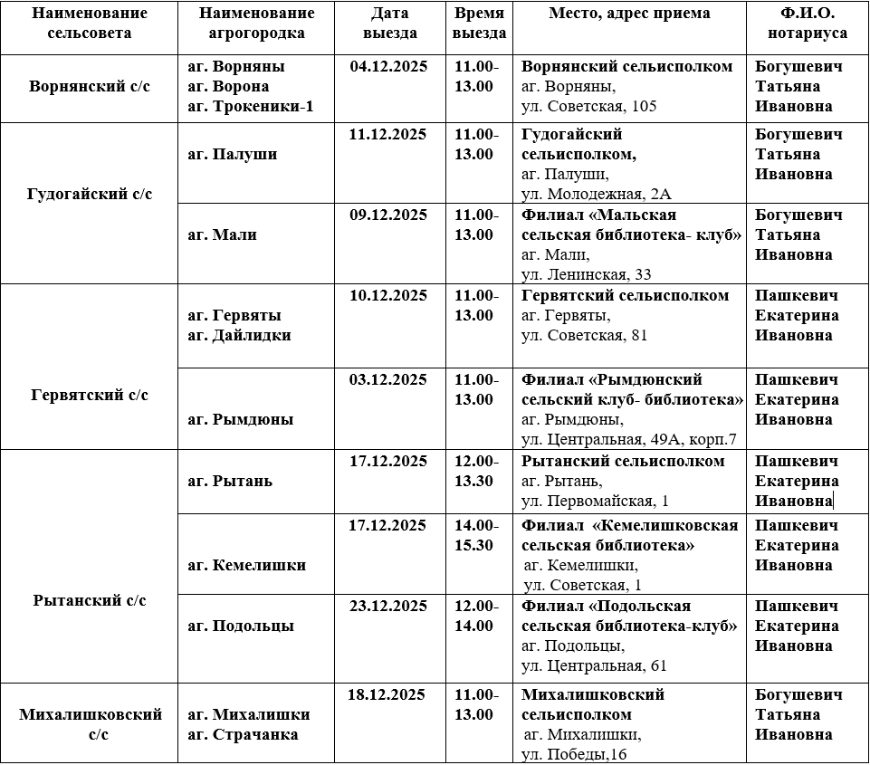 В декабре 2025 года запланированы выезды нотариусов в агрогородки по графику